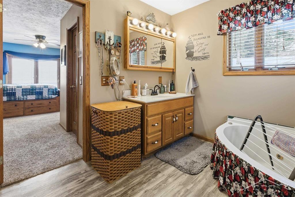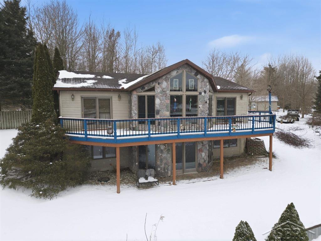 Sold on Sutherly! Welcome to a custom-built lakefront retreat where every detail has been thoughtfully designed to embrace the water views that greet you at every turn. This stunning 4-bedroom, 3-bathroom home delivers 2,720 square feet of living space across two beautifully finished levels, all perched on 170 feet of private waterfront with a steel seawall and boat hoist, ready for the lakes return! The main floor showcases an expansive open layout anchored by knotty pine cathedral ceilings in the living room, where walls of windows flood the space with natural light. Step on to the massive elevated deck and take in panoramic lake views that never get old. The large kitchen features Corian countertops and hickory cabinets that flows seamlessly into the living areas, while an integrated interior speaker system sets the mood throughout. The primary bedroom is a generous main-level suite with its own lake view, walk-in closet, and oversized soaking tub. Completing the main floor is a second bedroom and main full bathroom. Below, the walkout basement expands your living and entertaining possibilities with a spacious family room warmed by a gas stone fireplace. Two additional bedrooms with lake views and a full bathroom provide comfortable quarters for family or guests. A finished storage room or home office allows for additional flexibility without the sacrifice. The lower-level stone patio opens directly to your lakefront entertaining space — an ideal spot for gatherings under the warm summer sun. The lot itself is nothing short of extraordinary, situated on 2 full acres. A she shed/pool house with electricity elevates the above ground pool experience, while waiting for your lake to return you can still enjoy your summer in the water. An attached two full car finished and heated garage, plus a 28'x36' detached garage with power and a pellet stove ensures you will never run out of storage or workspace. The grounds feature a fruit orchard with three varieties of grape vines, apple trees including Honeycrisp and Sweet Sixteen, plus peach, plum, black cherry, and pear trees. A sprinkler system and yard shed round out this incredible property. This is waterfront living at its finest, located in a desirable area with extra deep waterfront ensures endless amounts of swimming and boating is in your future. Where quality construction meets lakeside serenity - schedule your private showing today and prepare to fall in love.